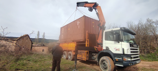 Because there is no house in Bárcena that has a door, let alone a lock, we cannot leave any belongings behind. Before we could get a house to that point, we first need a place to store tools. To solve this chicken and egg problem, we ordered a container. Naturally, we asked if it could be delivered to Bárcena and at the time when we would be there.